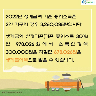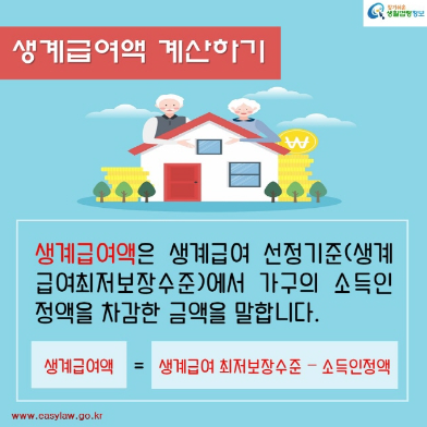 | 생계급여액 = 생계급여 최저보장수준(대상자 선정기준) - 가구의 소득인정액 |