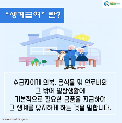 생계급여는 수급자에게 의복, 음식물 및 연료비와 그 밖에 일상생활에 기본적으로 필요한 금품을 지급하여 그 생계를 유지하게 하는 것을 말합니다.