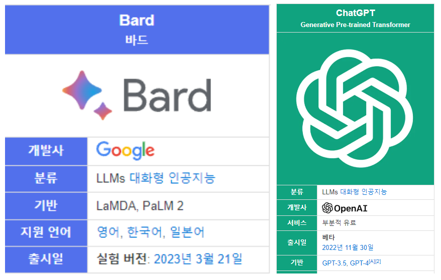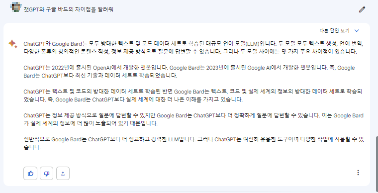 - 질문 : 챗 GPT와 구글 바드의 차이점을 알려줘