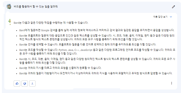 - 질문 : 바드를 활용해서 할 수 있는 일을 알려줘