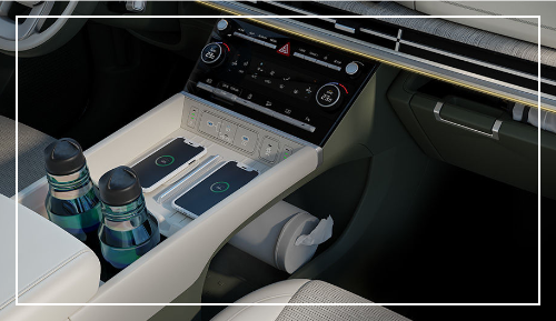 산타페의 크기가 많이 커진 만큼 앞 좌석 공간의 여유가 많아졌고 무선충전 자리도 2개가 마련되어 있습니다.