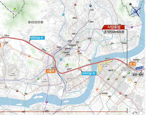 | GTX - A 노선도 운정 > 킨덱트 > 대곡 > 연신내 > 서울역 > 삼성 > 수서 > 성남 > 용인 > 동탄 |